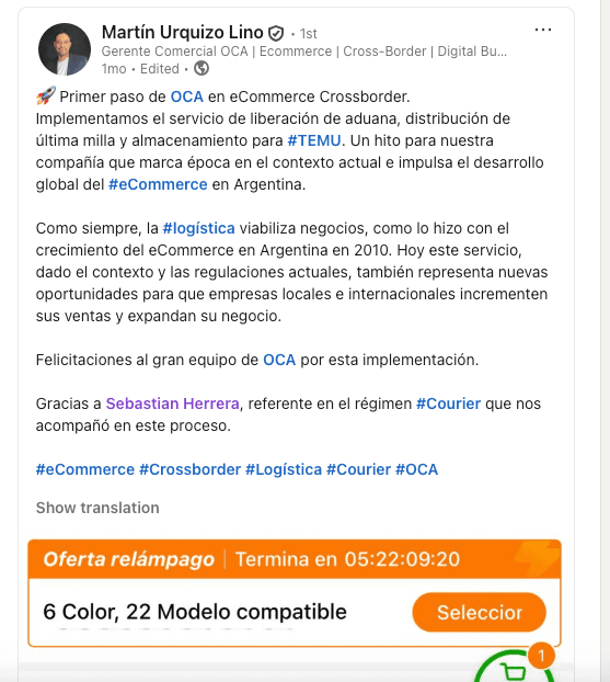 ๐ First step of OCA in Cross-border eCommerce. We implemented customs clearance, last-mile distribution, and warehousing services for #TEMU. Today, this service, given the current context and regulations, also represents new opportunities for local and international companies to increase their sales and expand their business.